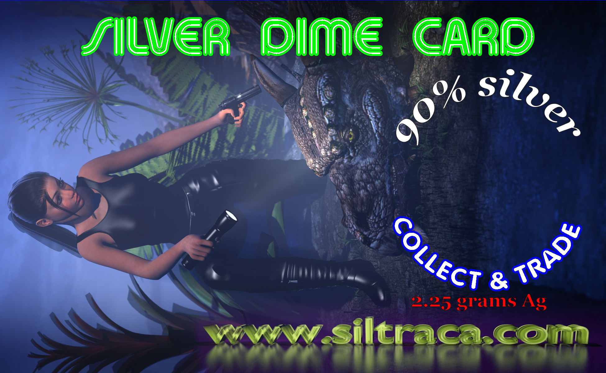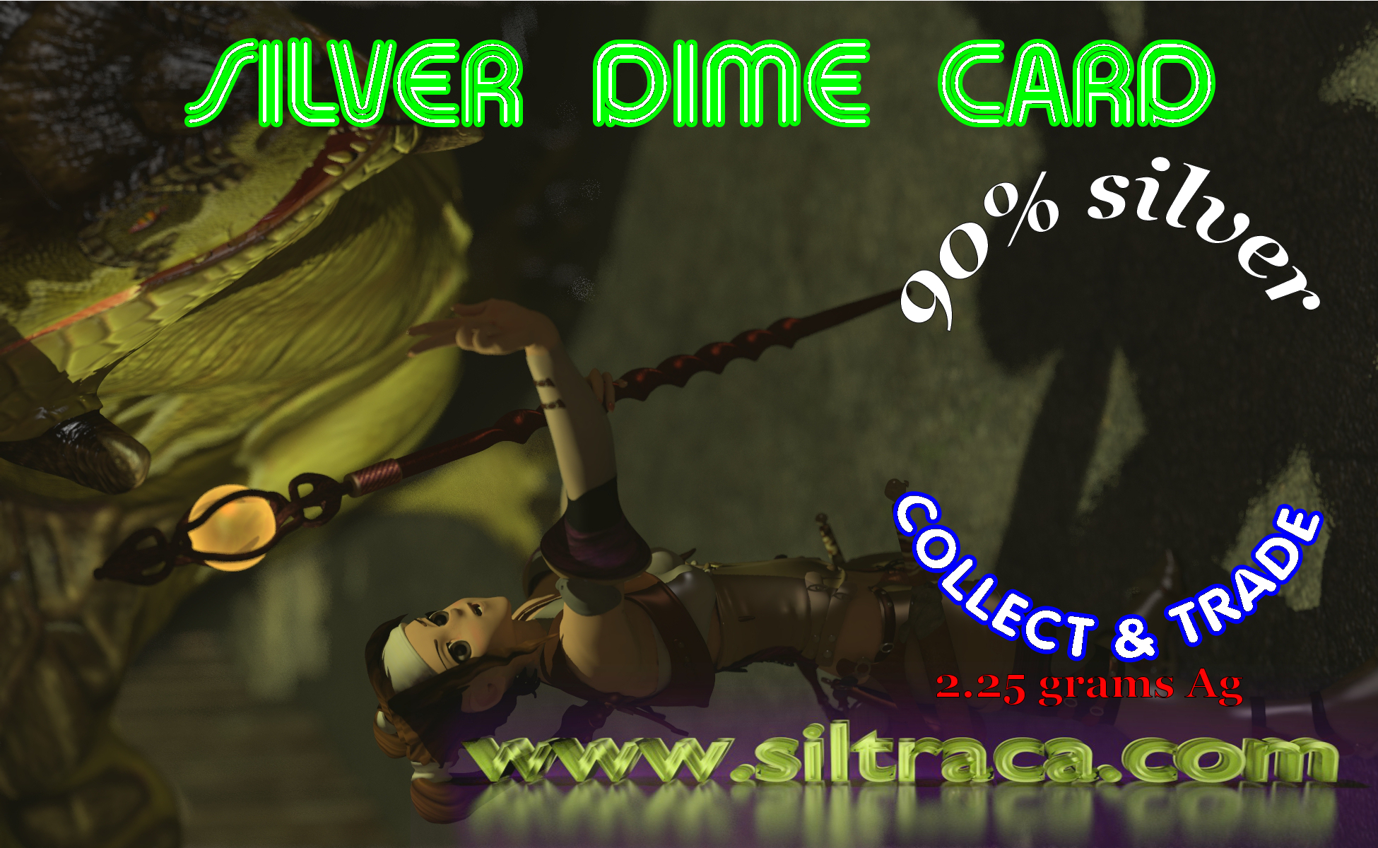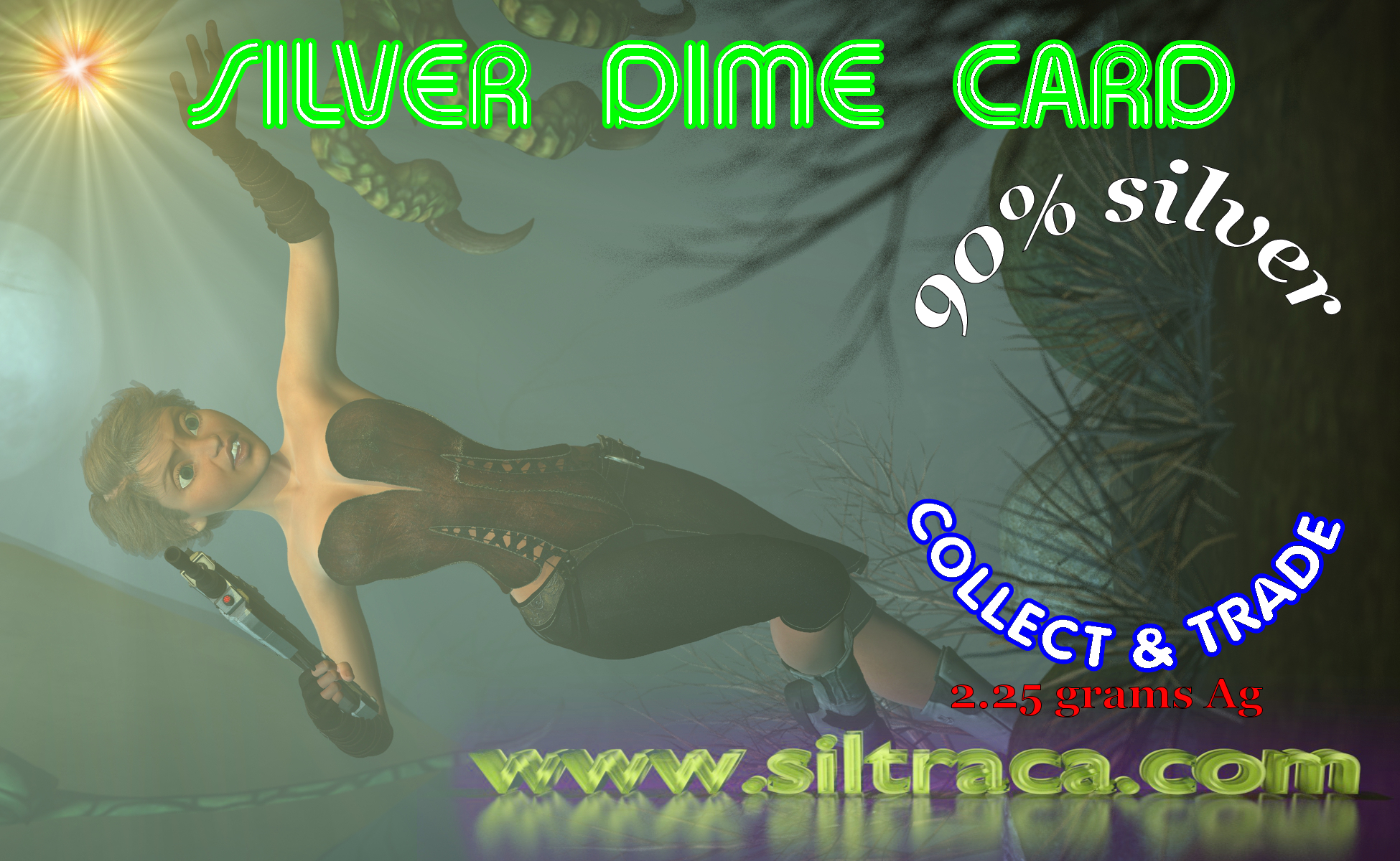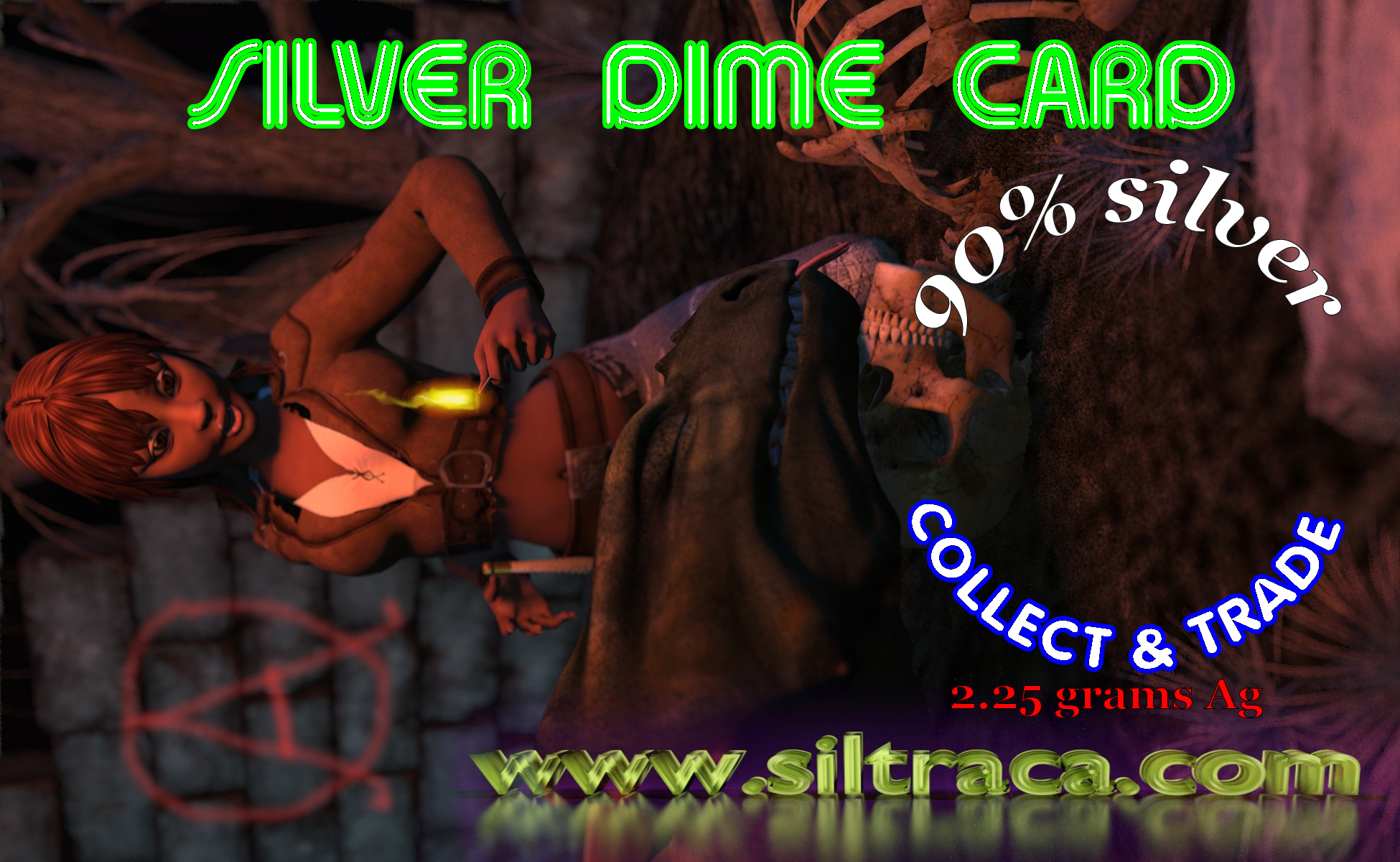 SilTraCa’s very first series (s1) and book (b1). This is the second version (v2), released in 2014, comprising nine different card designs. New in this version: Nine different rear (tail) designs; nine different front (head) designs. Production limited to 99 of each design, all art by Jonny Stryder. All other qualities as described on SilTraCa’s home page for Liberty Dime Cards. The nine different back designs and nine different front designs are shown below. Photographs of finished cards may be viewed at the artist’s e-commerce site (Etsy).